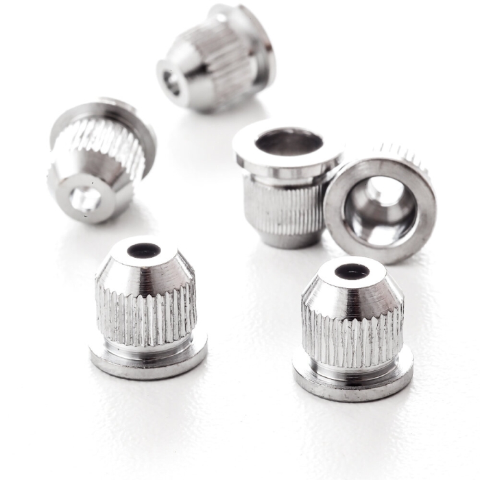 Buchas Passa Corda (Through-Body) para instrumentos que possuam fixação das cordas na parte de trás do corpo, recomendado o uso com ponte modelo JPN/JSB, em acabamento cromado, 6 unidades, Spirit Guitar Parts - JTE-CR.