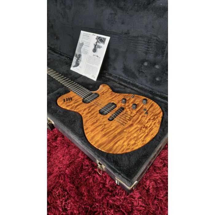 Madeiras Nobres e Acabamento Excepcional: Esta unidade na cor Trans Amber revela um deslumbrante tampo em maple flamejado (flamed maple) , com veios profundos e um brilho âmbar que confere personalidade única ao instrumento. O corpo em mogno (mahogany) garante sustain encorpado e ressonância calorosa. O braço também em mogno e a escala em ébano (ebony) , conhecida por sua resposta rápida e definição, completam esta combinação de madeiras de altíssimo nível .