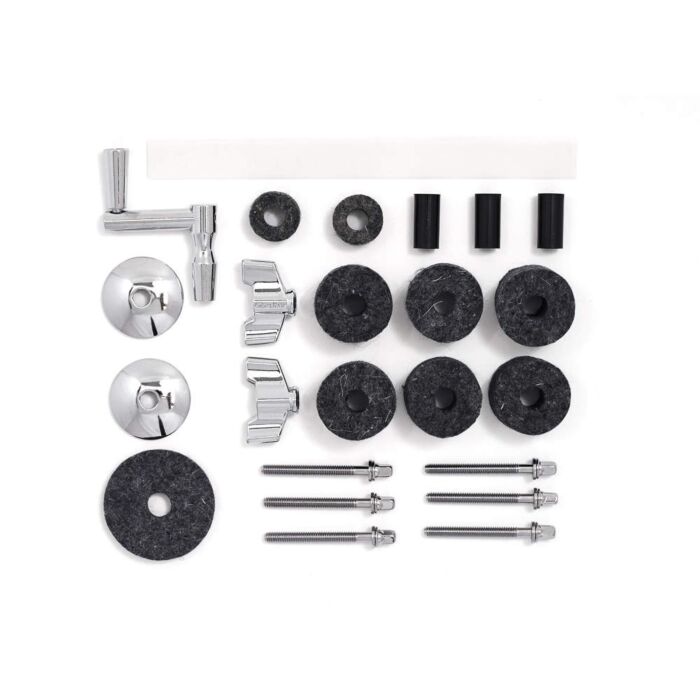 Kit de primeiros socorros com componentes para Bateria. Inclui: parafusos, feltros para estantes de pratos, feltros para presilha de chimbal, feltro para base de chimbal, protetores para estantes de pratos, arruelas para estantes de prato, porca-borboletas e chave de tensão. Gibraltar SC-DSTK.