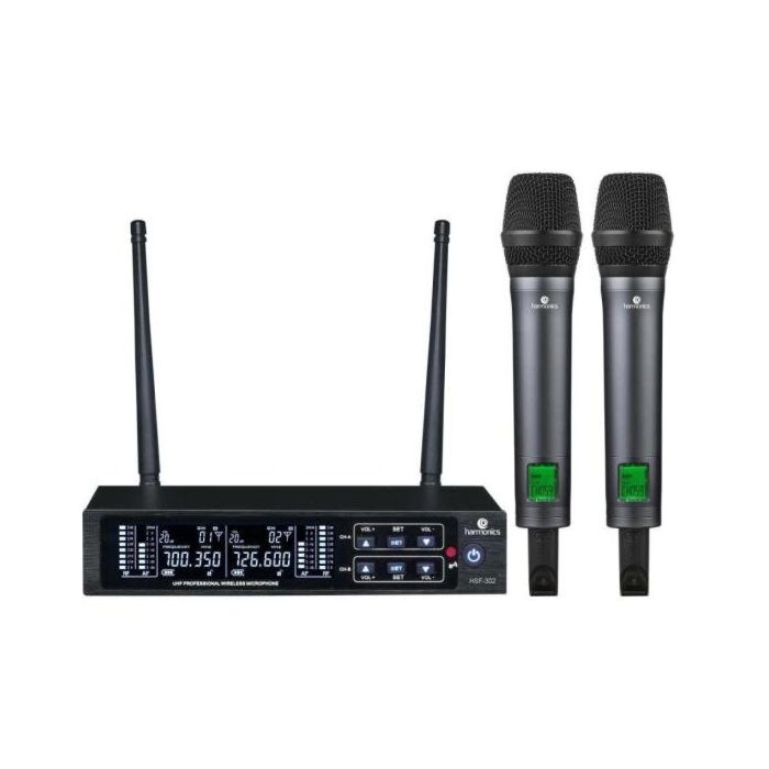 O Microfone Sem Fio UHF multi-frequência com Display Digital e função Auto Scan Harmonics HSF300 Duplo é um sistema sem fio de mão duplo projetado para fornecer qualidade de som excepcional em apresentações ao vivo, karaokê, eventos corporativos e outras situações de desempenho. Este microfone sem fio possui duas unidades de mão com transmissores de frequência UHF independentes, o que significa que cada microfone pode ser usado individualmente ou simultaneamente para oferecer um desempenho em dueto.