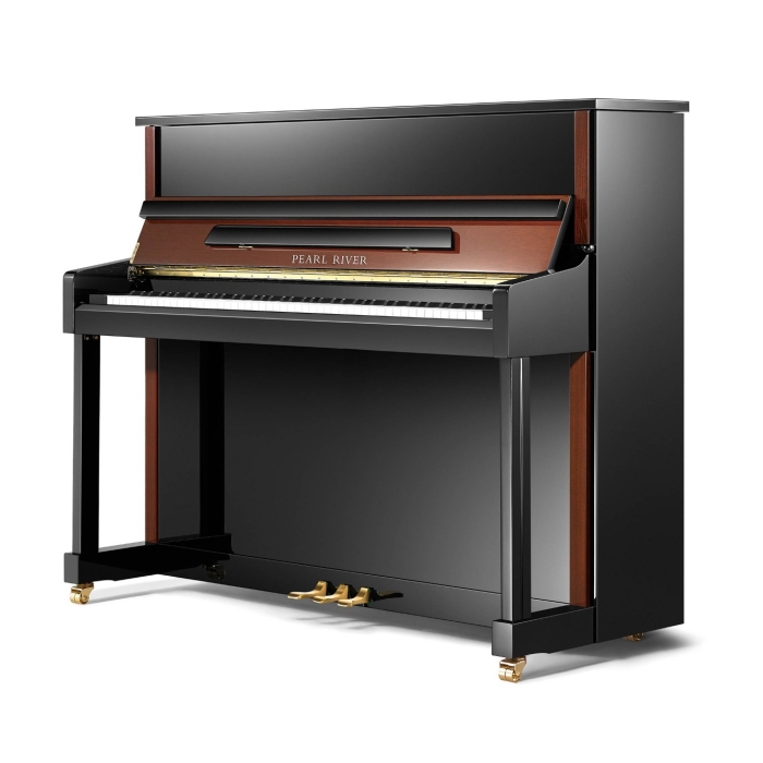 Description / PE121 Pearl River Tradicional Series Piano Acústico Vertical com Sistema Intelligent e Silent Preto Polido e Mogno Texturizado| Teclacenter